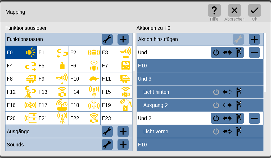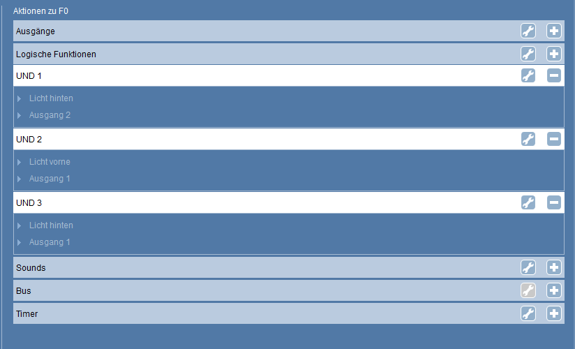 Und während früher klassischerweise direkt Ausgänge mit Lichtfunktionen geschaltet wurden, ist in der Aktionsansicht (siehe Ansicht F0 im mDecoderTool3) kein Ausgang mehr verknüpft sondern 3 Logische Funktionen des Typs „UND“. Wenn man sich jetzt an die Schaltung eines UND Gatters erinnert, dann kommt man darauf, dass F0 hier nichts als direkter Aktionsauslöser fungiert sondern als ein(!) Eingang der jeweilig genannten UND Funktionen (Gatter in Hardware Sprechweise). Das bedeutet bspw. für UND1 ist F0 einer der Eingänge, da aber eine UND Funktion mindestens noch einen Eingang braucht, muss man den suchen. Und weder im mDecoderTool3 noch in der CS3 gibt es hierzu eine Übersicht.